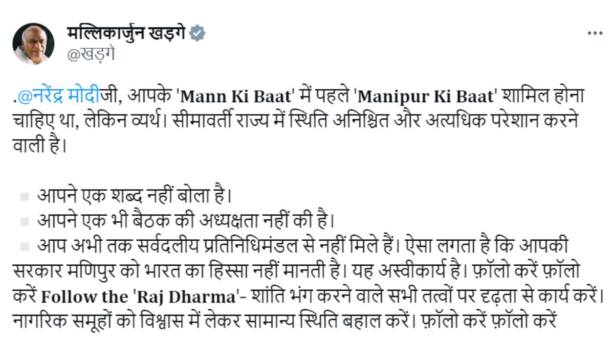 कांग्रेस अध्यक्ष मल्लिकार्जुन खरगे ने पीएम मोदी पर तंज कसते हुए कहा कि मन की बात में पहले '𝐌𝐚𝐧𝐢𝐩𝐮𝐫 𝐊𝐢 𝐁𝐚𝐚𝐭' शामिल होना चाहिए था। उन्होंने कहा कि पीएम को अपना राजधर्म भी सही से निभाना चाहिए।