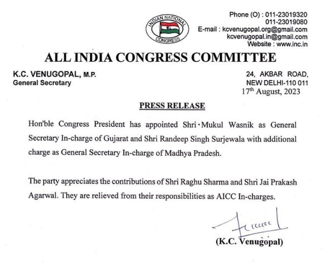 कांग्रेस ने मुकुल वासनिक को गुजरात और रणदीप सुरजेवाला को मध्य प्रदेश का प्रभारी महासचिव किया नियुक्त