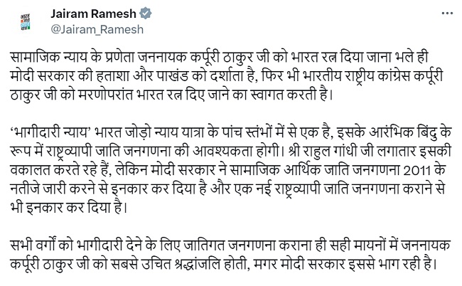 कांग्रेस महासचिव जयराम रमेश ने एक्स पर पोस्ट किया। उन्होंने लिखा- 'सामाजिक न्याय के प्रणेता जननायक कर्पूरी ठाकुर जी को भारत रत्न दिया जाना भले ही मोदी सरकार की हताशा और पाखंड को दर्शाता है, फिर भी भारतीय राष्ट्रीय कांग्रेस कर्पूरी ठाकुर को मरणोपरांत भारत रत्न दिए जाने का स्वागत करती है।