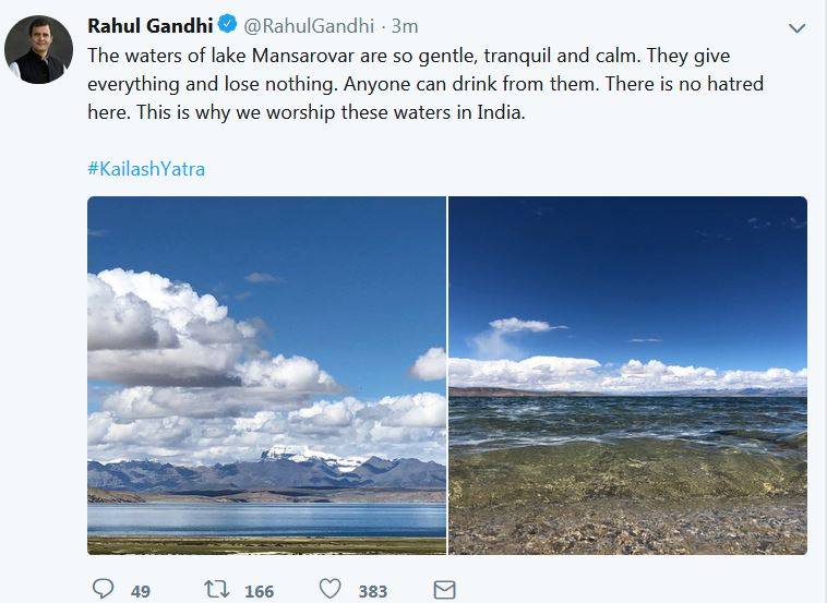 राहुल ने इसके अलावा एक और ट्वीट करते हुए मानसरोवर के पास मौजूद झील की तस्वीर शेयर की। उन्होंने लिखा कि मानसरोवर झील का पानी बेहद शांत, स्थिर और कोमल है। यह झील सब कुछ देती है और कुछ नहीं लेती। कोई भी यहां से पानी ग्रहण कर सकता है। यहां कोई घृणा नहीं है। इसलिए भारत में इस जल को पूजा जाता है।'