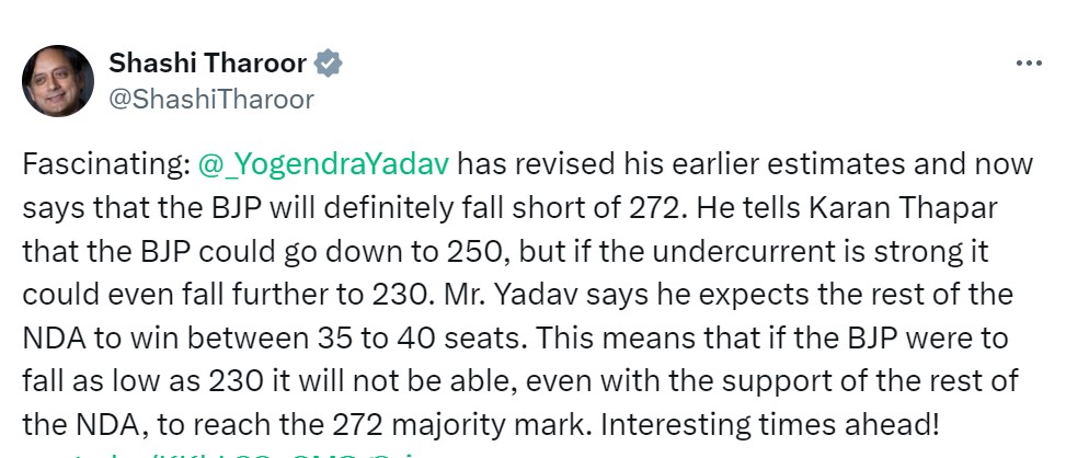 उन्होंने कहा कि इसका मतलब है कि अगर भाजपा 230 के आंकड़े के नीचे रहती है तो, वह एनडीए के बाकी हिस्सों के समर्थन के साथ भी 272 के बहुमत के आंकड़े तक नहीं पहुंच पाएगी। थरूर ने योगेंद्र यादव के इस आकलन पर कहा कि यह बेहद आकर्षक और उत्साह बढ़ाने वाला है।