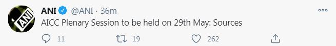 इससे पहले समाचार एजेंसी एएनआइ ने सूत्रों के हवाले से जानकारी दी कि कांग्रेस संगठन के चुनाव मई महीने में कराए जा सकते हैं। समाचार एजेंसी एएनआइ ने सूत्रों के हवाले से जानकारी दी है कि अखिल भारतीय कांग्रेस कार्यसमिति का प्लेनरी सत्र 29 मई को आयोजित किया जाएगा। बता दें कि आज कांग्रेस कार्यसमिति की बैठक हुई। इस बैठक की अध्यक्षता पार्टी की अंतरिम अध्यक्ष सोनिया गांधी ने की। कांग्रेस पार्टी की ये मीटिंग वीडियो कॉन्फ्रेंसिंग के माध्यम से आयोजित की गई। इस बैठक में सोनिया गांधी ने किसानों के मुद्दे पर केंद्र सरकार पर जमकर हमला बोला।