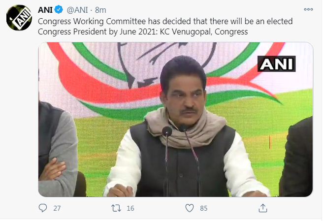 नई दिल्ली, एएनआइ। कांग्रेस को लेकर इस वक्त एक बड़ी खबर आ रही है। कांग्रेस कार्यसमिति की बैठक में फैसला लिया गया है कि कांग्रेस को जून 2021 तक अपना नया अध्यक्ष मिल जाएगा। कांग्रेस नेता केसी वेणुगोपाल ने इसकी जानकारी देते हुए बताया कि कांग्रेस कार्यसमिति ने निर्णय लिया है कि जून 2021 तक कांग्रेस के पास एक निर्वाचित अध्यक्ष होगा।