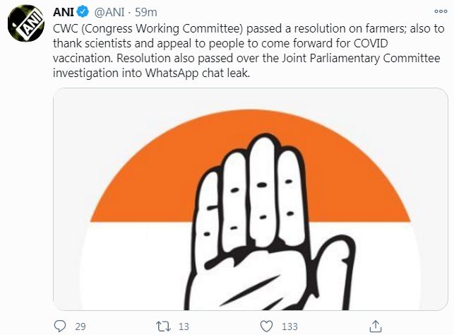 कांग्रेस कार्यसमिति(CWC) ने किसानों के मुद्दे पर एक प्रस्ताव पारित किया। इसके अलावा COVID टीकाकरण के लिए वैज्ञानिकों को धन्यवाद देने और लोगों से आगे आने की अपील करने के लिए भी प्रस्ताव पारित किया। इसके अलावा इस बैठक में सीडब्ल्यूसी ने अर्नब गोस्वामी की व्हाट्सएप चैट लीक को राष्ट्रीय सुरक्षा भंग करने का आरोप लगाया है और इसकी संयुक्त संसदीय समिति(जेपीसी) की जांच में प्रस्ताव भी पारित हुआ।