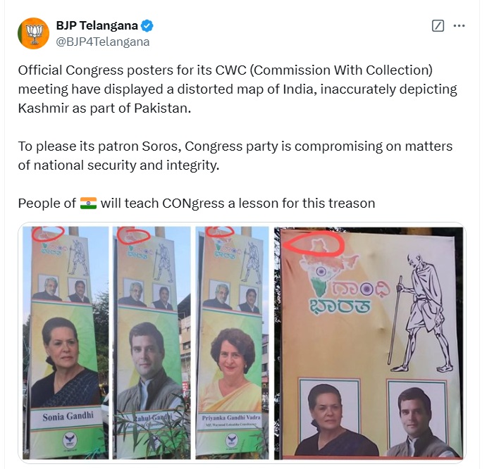 तेलंगाना भाजपा ने इस विकृत पोस्टर की तस्वीर पोस्ट की है। तस्वीर पोस्ट करते हुए तेलंगाना भाजपा ने लिखा,"कांग्रेस की CWC (कमीशन विद कलेक्शन) मीटिंग के लिए लगाए गए आधिकारिक पोस्टरों में भारत का विकृत नक्शा दिखाया गया है, जिसमें कश्मीर को पाकिस्तान का हिस्सा बताया गया है। अपने संरक्षक सोरोस को खुश करने के लिए कांग्रेस पार्टी राष्ट्रीय सुरक्षा और अखंडता के मामलों से समझौता कर रही है। देश की जनता कांग्रेस को इस देशद्रोह के लिए सबक सिखाएगी।"