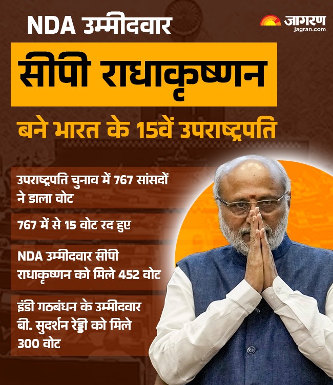 उपराष्ट्रपति चुनाव में एनडीए उम्मीदवार सीपी राधाकृष्णन ने जीत हासिल की है। उन्हें 452 वोट मिले जबकि इंडी गठबंधन के उम्मीदवार बी. सुदर्शन रेड्डी को 300 वोट मिले। कुल 767 सांसदों ने मतदान किया जिसमें से 15 वोट रद्द हो गए। राष्ट्रपति द्रौपदी मुर्मू और प्रधानमंत्री नरेंद्र मोदी ने सीपी राधाकृष्णन को उनकी जीत पर बधाई दी है। सीपी राधाकृष्णन देश के 15वें उपराष्ट्रपति होंगे।