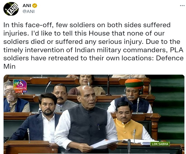 तवांग में हुई झड़प पर रक्षा मंत्री राजनाथ सिंह ने लोकसभा में कहा भारतीय सेना ने बहादुरी से PLA को हमारे क्षेत्र में अतिक्रमण करने से रोका और उन्हें उनकी केंद्र पर वापस जाने के लिए मजबूर कर दिया। इस झड़प में दोनों ओर के कुछ सैनिकों को चोटें आईं हैं। राजनाथ सिंह ने आगे कहा कि 9 दिसंबर 2022 को PLA गुट ने तवांग सेक्टर के यांग्त्से क्षेत्र में LAC पर अतिक्रमण कर यथास्थिति को एकतरफा बदलने का प्रयास किया। चीन के इस प्रयास का हमारी सेना ने दृढ़ता के साथ सामना किया। इस झड़प में हाथापाई हुई।