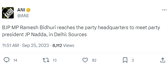भाजपा सांसद रमेश बिधूड़ी ( BJP MP Ramesh Bidhuri ) दिल्ली में पार्टी अध्यक्ष जेपी नड्डा से मिलने पार्टी मुख्यालय पहुंचे। लोकसभा के विशेष सत्र के दौरान भाजपा सांसद रमेश बिधूड़ी ने बीसएपी नेता दानिश अली के खिलाफ काफी आपत्तिजनक और अभद्र भाषा का उपयोग किया था। उनके इस भाषा का कई विपक्षी दलों ने जमकर आलोचना की और जल्द से जल्द इस पर कार्रवाई करने की मांग की है।