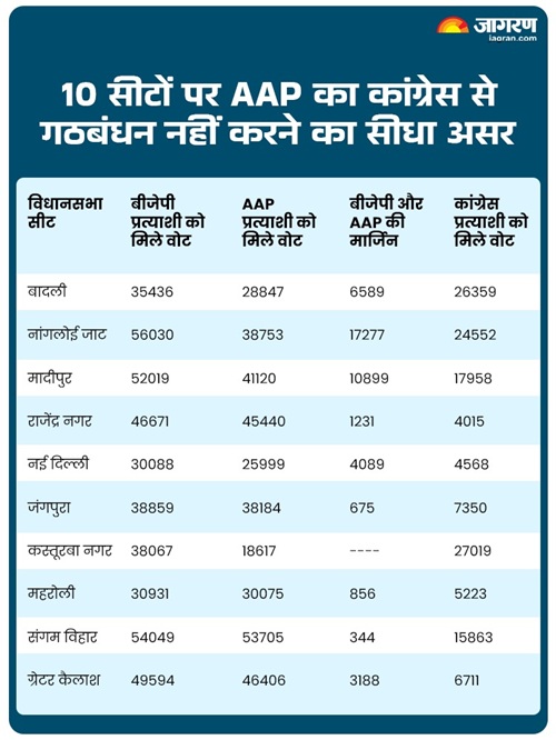 दिल्ली के 10 ऐसी सीटें हैं, जहां आप और कांग्रेस के गठबंधन न करने का सीधा असर दिखा है।