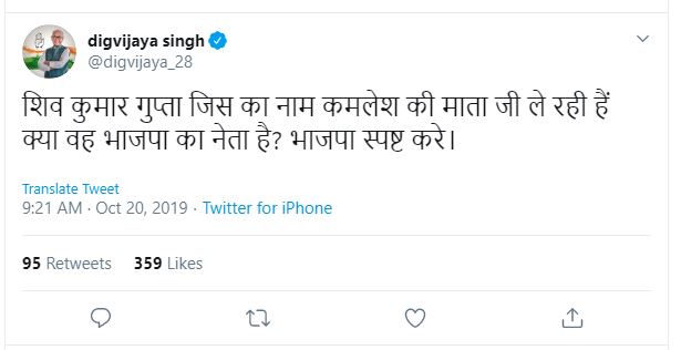 उन्होंने एक के बाद किए ट्वीट में सवाल किया कि कमलेश की मां जिस शिव कुमार गुप्ता का नाम ले रही हैं, उसे गिरफ्तार क्यों नहीं किया जा रहा है। उसकी गिरफ्तारी के लिए और क्या प्रमाण चाहिए। क्या शिव कुमार भाजपा नेता हैं।