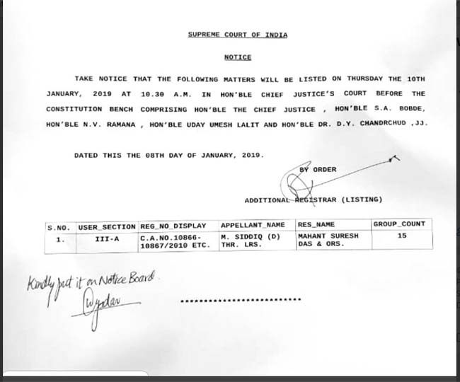 पिछली सुनवाई गत चार जनवरी को मुख्य न्यायाधीश रंजन गोगोई और जस्टिस संजय किशन कौल की पीठ ने मामले को उचित पीठ के समक्ष 10 जनवरी को सुनवाई पर लगाने का आदेश दिया था। इसी से तय हो गया था कि 10 जनवरी तक नई पीठ का गठन हो जाएगा। मंगलवार को सुप्रीम कोर्ट से जारी नोटिस में पीठ गठन की जानकारी दी गई है।