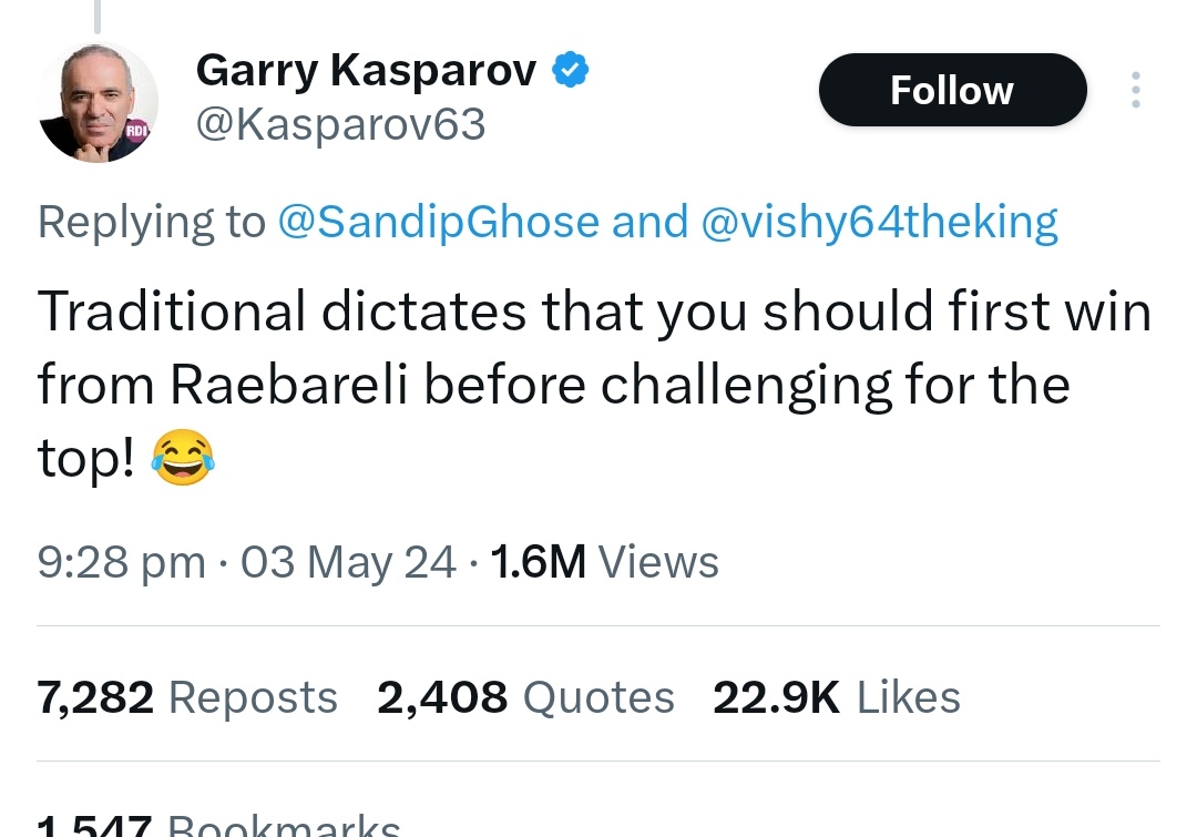 कांग्रेस की ओर से शतरंज पर चर्चा करते राहुल गांधी का वीडियो जारी करने के एक दिन बाद गैरी कास्पारोव ने शुक्रवार को एक्स पर एक पोस्ट किया। इसमें उन्होंने लिखा, 'परंपरा कहती है कि पहले आप रायबरेली जीतें और फिर शीर्ष पद के लिए चुनौती दें।'