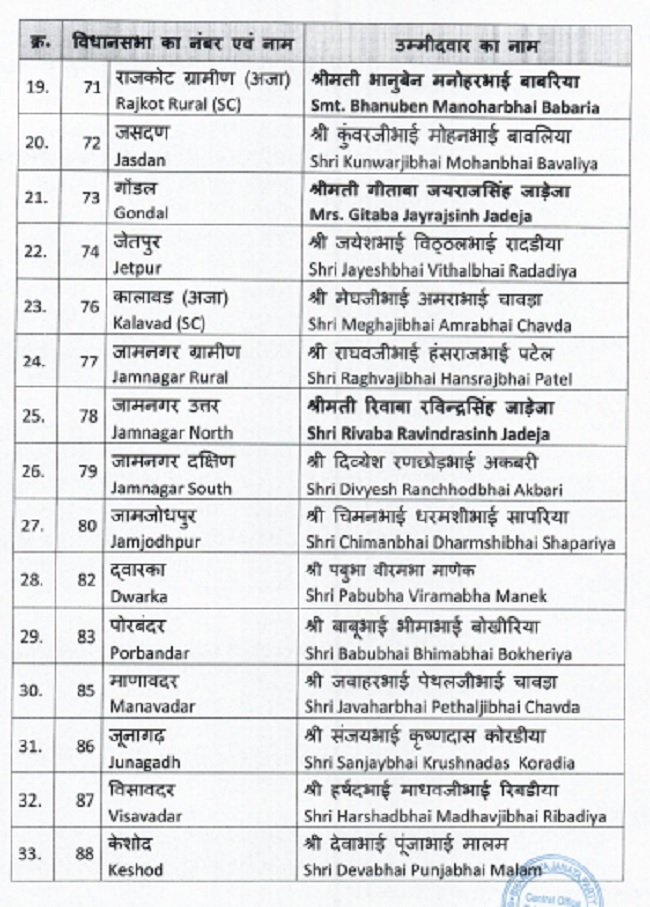 बड़ी बात यह है कि क्रिकेटर रविंद्र जड़ेजा की पत्नी को जामनगर नॉर्थ से टिकट दिया गया है। वहीं, हार्दिक पटेल विरमगाम सीट से पहली बार कोई चुनाव लड़ेंगे। भाजपा की पहली सूची में 14 महिलाओं को टिकट मिला है। 69 सिटिंग विधायकों को टिकट दिया गया है। 99 में से 69 को टिकट मिला है, यानी 30 लोगों का टिकट कट गया है। राजकोट पश्चिम से विजय रूपाणी चुनाव लड़ते थे, उनकी जगह डॉक्टर दर्शिता शाह को टिकट मिला है।
