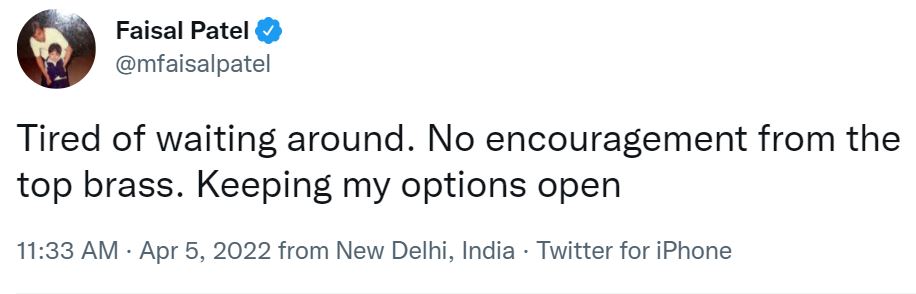 फैसल पटेल ने अपने ताजा ट्वीट में पार्टी छोड़ने का इशारा किया है। उन्होंने ट्वीट कर कहा कि इंतजार करके थक गया हूं। पार्टी के टाप नेताओं से कोई प्रोत्साहन नहीं मिला है। मेरे लिए सभी आप्शन खुले हैं। हालांकि, उन्होंने ट्वीट में ये नहीं लिखा कि उन्हें टाप नेताओं से किस तरह के प्रोत्साहन की उम्मीद है।