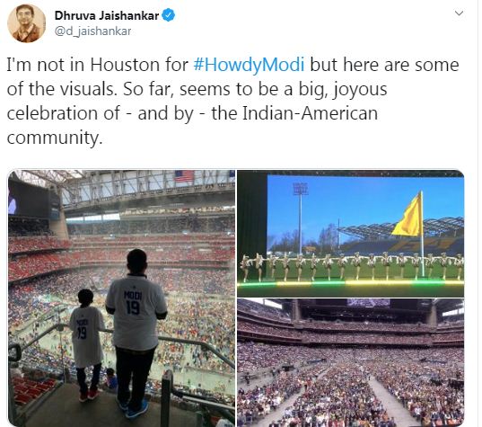 Howdy Modi हैशटैग के साथ ध्रुव जैशंकर ने ट्विटर पर लिखा कि मैं Howdy Modi के लिए ह्यूस्टन में नहीं हूं, लेकिन यहां के दृश्य बेहद खास हैं। यह कार्यक्रम भारतीय और अमेरिकी समुदाय के लिए एक खुशी का उत्सव है।
