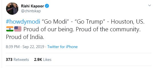 बॉलीवुड एक्टर ऋषि कपूर ने पीएम मोदी के Howdy Modi कार्यक्रम पर ट्विट करते हुए लिखा कि अमेरिका के ह्यूस्टन शहर में भारत और अमेरिका के लोगों के लिए एक गर्व का की बात है। यह भारतीय होने का गर्व है।