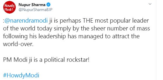 भाजपा की प्रवक्ता नुपुर शर्मा ने Howdy Modi हैशटैग के साथ ट्विटर पर लिखा कि पीएम नरेंद्र मोदी दुनिया के सबसे लोकप्रिय नेता हैं। उनके नेतृत्व के बाद बड़े पैमाने पर लोगों की संख्या दुनिया भर को आकर्षित करने में कामयाब रही है।