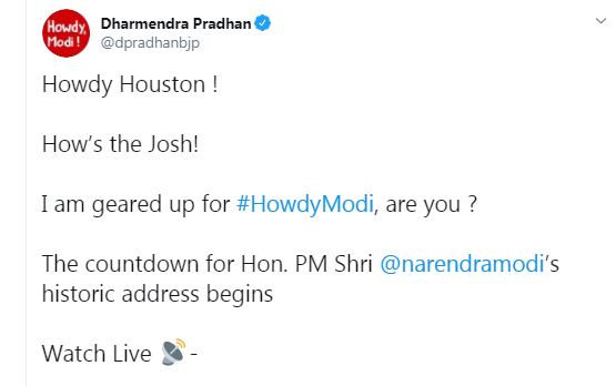 ट्विटर पर केंद्रीय मंत्री धर्मेंद्र प्रधान ने Howdy Modi हैशटैग के साथ How’s the Josh! लिखते हुए लिखा कि Howdy Houston ! इसके साथ ही उन्होंने आगे लिखा कि मैं Howdy Modi के लिए तैयार हूं, क्या आप हैं ? क्योंकि, पीएम मोदी के कार्यक्रम के लिए उलटी गिनती शुरू हो चुकी है।