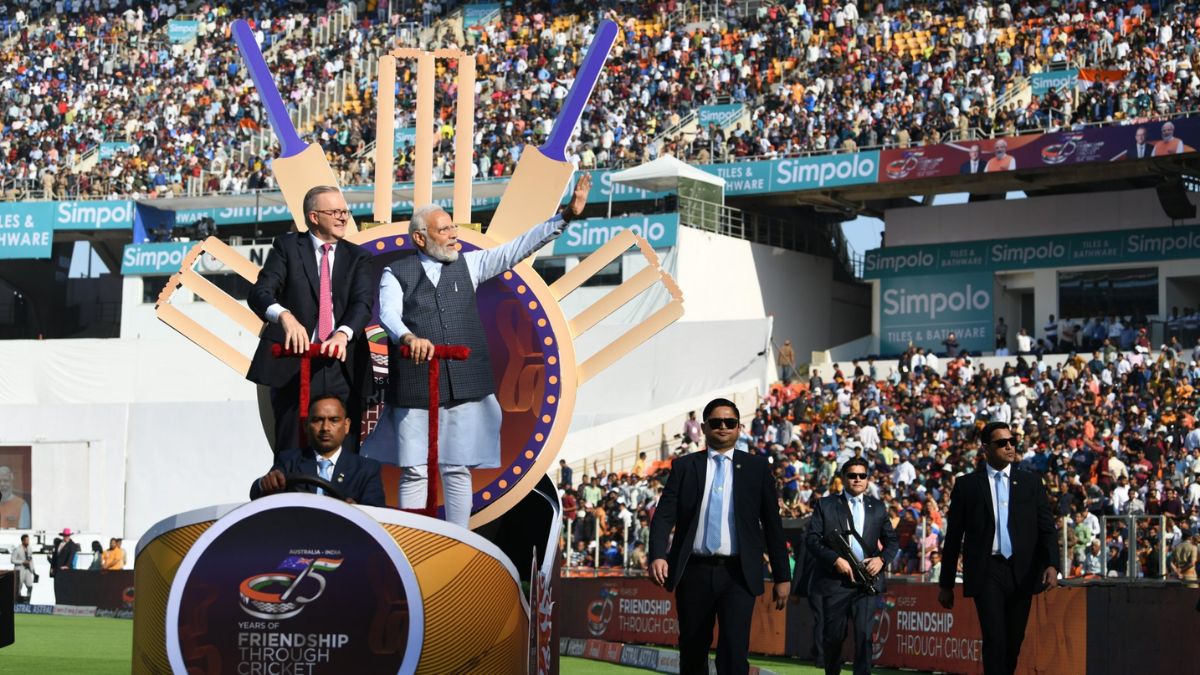 बता दें कि भारत-ऑस्ट्रेलिया के बीच दोस्ती को 75 साल पूरे होने पर दोनों देशों के बीच हो रहे इस मैच को यादगार क्षण के रूप में देखा जा रहा है। इस अवसर पर पीएम मोदी और ऑस्ट्रेलियाई पीएम  एंथनी अल्बानीज एक अलग डिजाइन की गई गोल्फ कार पर पूरे मैदान में घूमें और उन्हें लैप ऑफ ऑनर दिया गया। बता दें कि इस कार पर एक होर्डिंग भी लगा था, जिसपर लिखा था- "75 इयर्स ऑफ फ्रेंडशिप थ्रू क्रिकेट''।