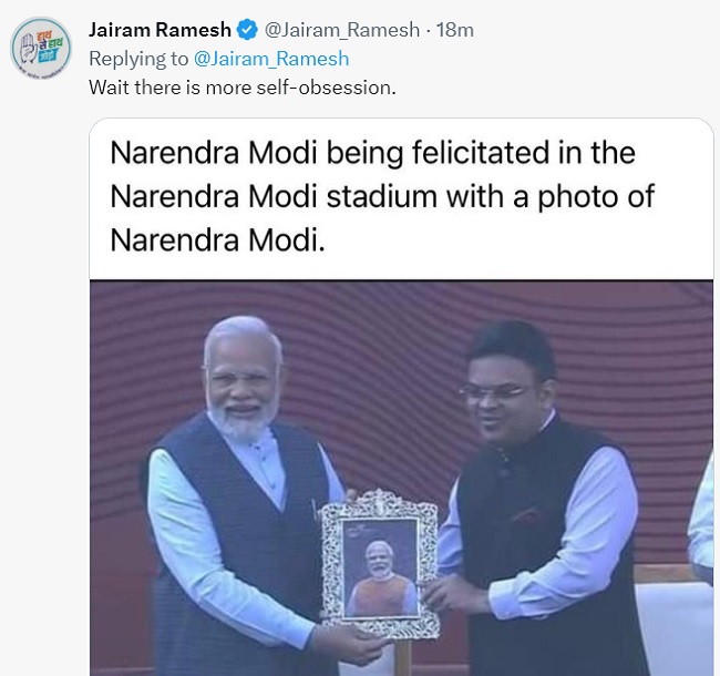 कांग्रेस नेता जयराम रमेश ने पीएम मोदी के अहमदाबाद के नरेंद्र मोदी स्टेडियम में जाने पर तंज कसा है। उन्होंने कहा कि अपने द्वारा बनाए गए अपने ही नाम वाले स्टेडियम में लैप ऑफ ऑनर लेना किसी आत्ममुग्ध व्यक्ति को ही अच्छा लगता है। उन्होंने कहा कि ये "आत्म-जुनून की हद" है। जयराम ने इसी के साथ कहा कि पीएम मोदी का उन्हीं की फोटो के साथ स्वागत भी किया जा रहा है।