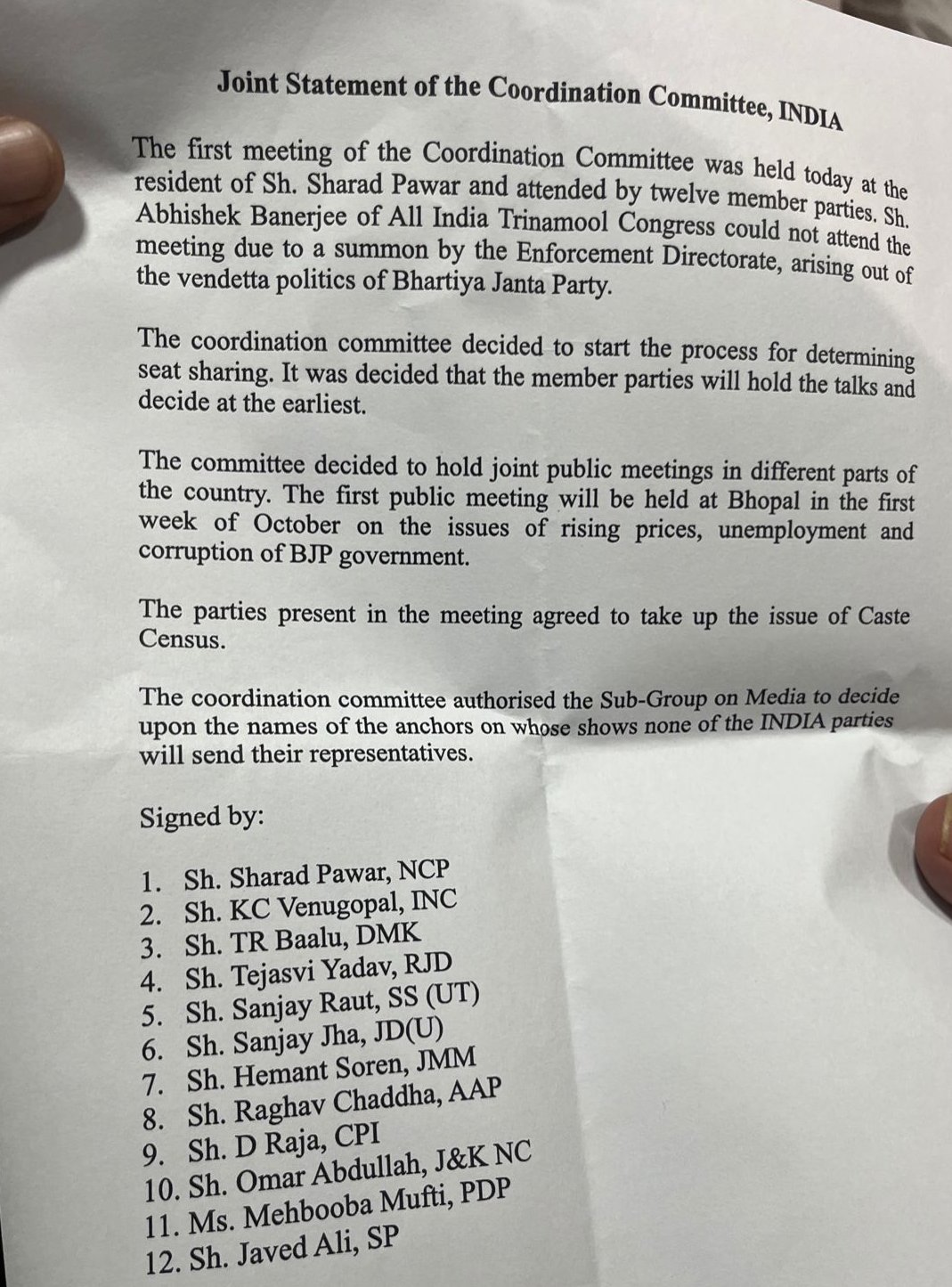 I.N.D.I.A गठबंधन की समन्वय समिति की पहली बैठक के बाद संयुक्त बयान जारी किया गया। बयान के अनुसार, पहली बैठक का आयोजन NCP प्रमुख शरद पवार के घर पर किया गया। इसमें बारह दलों के नेताओं ने हिस्सा लिया। इस बैठक में TMC नेता अभिषेक बनर्जी प्रवर्तन निदेशालय के समन के कारण शामिल नहीं हो पाए।