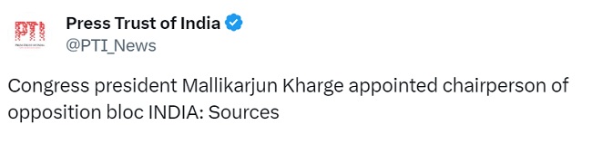समाचार एजेंसी पीटीआई ने सूत्रों के हवाले से बताया कि कांग्रेस के राष्ट्रीय अध्यक्ष मल्लिकार्जुन खरगे को विपक्षी गठबंधन 'INDI' का अध्यक्ष नियुक्त किया गया है।