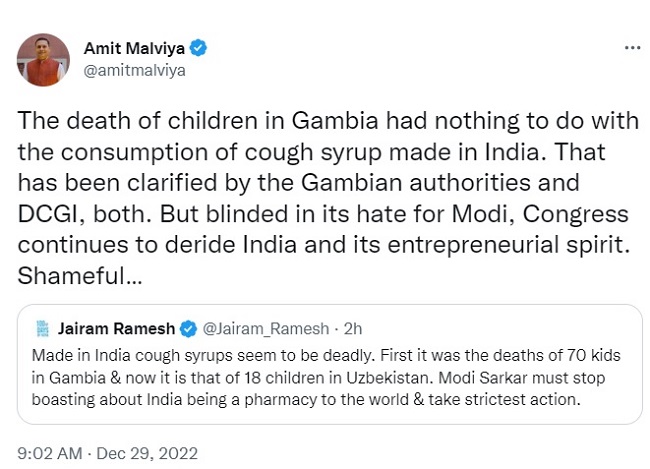 भाजपा नेता अमित मालवीय ने जयराम के ट्वीट का जवाब देते हुए कहा कि गाम्बिया में बच्चों की मौत का भारत में बनी खांसी की दवाई के सेवन से कोई लेना-देना नहीं है। यह गैम्बियन अधिकारियों और डीसीजीआई दोनों द्वारा स्पष्ट किया गया है। उन्होंने कहा कि मोदी से नफरत में कांग्रेस इतनी अंधी हो गई है कि वो भारत और उसकी उद्यमशीलता की भावना का उपहास करना जारी रख रही है जो कि शर्मनाक है।