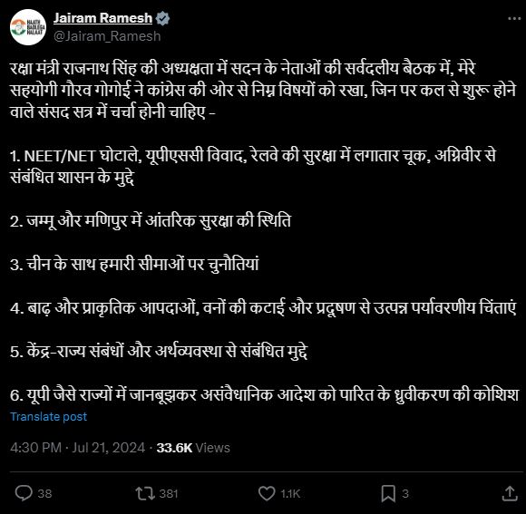 सर्वदलीय बैठक से एक्स पर लाइव पोस्ट कर रहे थे जयराम रमेश, भड़की BJP ने दे डाली नसीहत