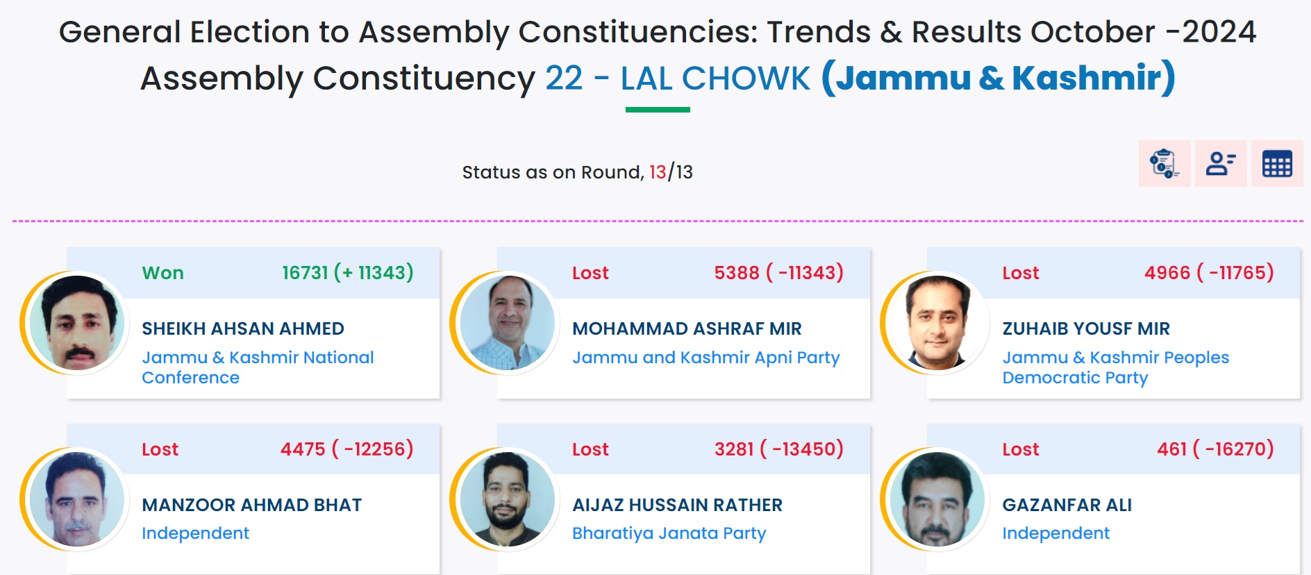 Jammu Kashmir Chunav 2024 लाल चौक विधानसभा सीट पर नेशनल कॉंफ्रेंस के उम्मीदवार शेख अहसान अहमद sheikh ahsan ahmed ने बाजी मार ली। उन्हें 16771 वोट मि ...और पढ़ें