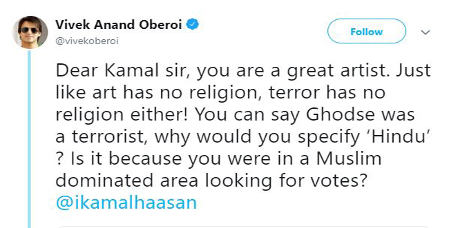 कमल हासन के इस बयान के बाद बॉलिवुड अभिनेता विवेक ओबेरॉय ने एक के बाद एक ट्वीट करते हुए लिखा 'डियर कमल सर, आप महान कलाकार हैं। जिस तरह कला का कोई धर्म नहीं होता, उसी तरह आतंक का भी कोई धर्म नहीं होता! आप ये कह सकते है कि गोडसे आतंकवादी हैं। आपने इसके लिए हिंदू शब्द का इस्तेमाल क्यों किया। यह सब इसलिए क्योंकि आप वोटों के लिए मुस्लिम बहुल इलाके में हैं?'