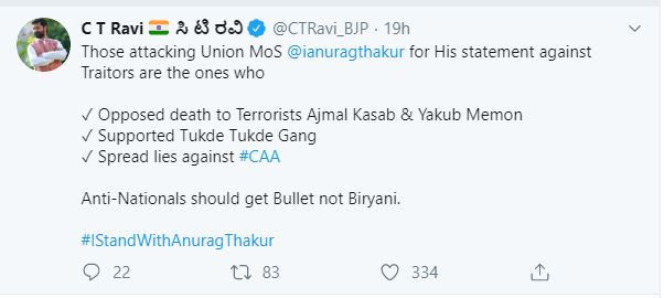 बैंगलोर, एएनआइ। कर्नाटक के मंत्री सीटी रवि भी केंद्रीय मंत्री और भाजपा सांसद अनुराग ठाकुर की राह पर चल दिए हैं। उन्होंने कहा है कि देशद्रोहियों को बिरयानी नहीं गोली मिलनी चाहिए। कर्नाटक के पर्यटन मंत्री सीटी रवि ने ट्वीट करते हुए टैग किया-#IStandWithAnuragThakur यानी मैं अनुराग ठाकुर के साथ खड़ा हूं। इसके अलावा उन्होंने ट्वीट में लिखा, 'जो लोग केंद्रीय राज्य मंत्री अनुराग ठाकुर का विरोध कर रहे हैं, ये वही लोग हैं जिन्होंने अजमल कसाब और याकूब मेनन की फांसी का विरोध किया था। टुकड़े-टुकड़े गैंग का सपोर्ट किया था। सीएए के खिलाफ झूठ फैलाया था। देश विरोधियों को बुलेट मिलना चाहिए न कि बिरयानी।