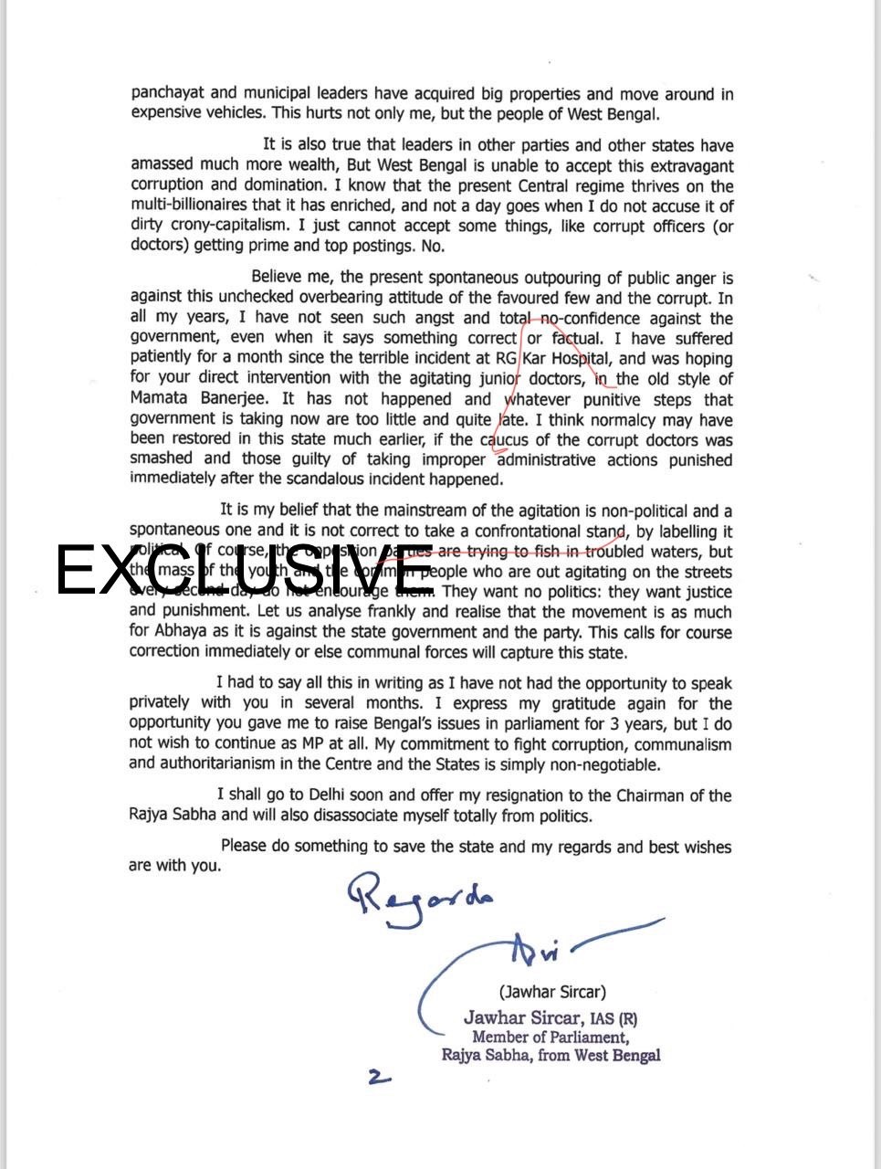 जवाहर ने अपने पत्र में कहा है कि कोलकाता में हो रहा मौजूदा विरोध प्रदर्शन जिसने बंगाल को झकझोर कर रख दिया है, वह तृणमूल सरकार के 'कुछ पसंदीदा और भ्रष्ट लोगों के अनियंत्रित दबंग रवैये' के खिलाफ जनता के गुस्से का प्रतिबिंब है।