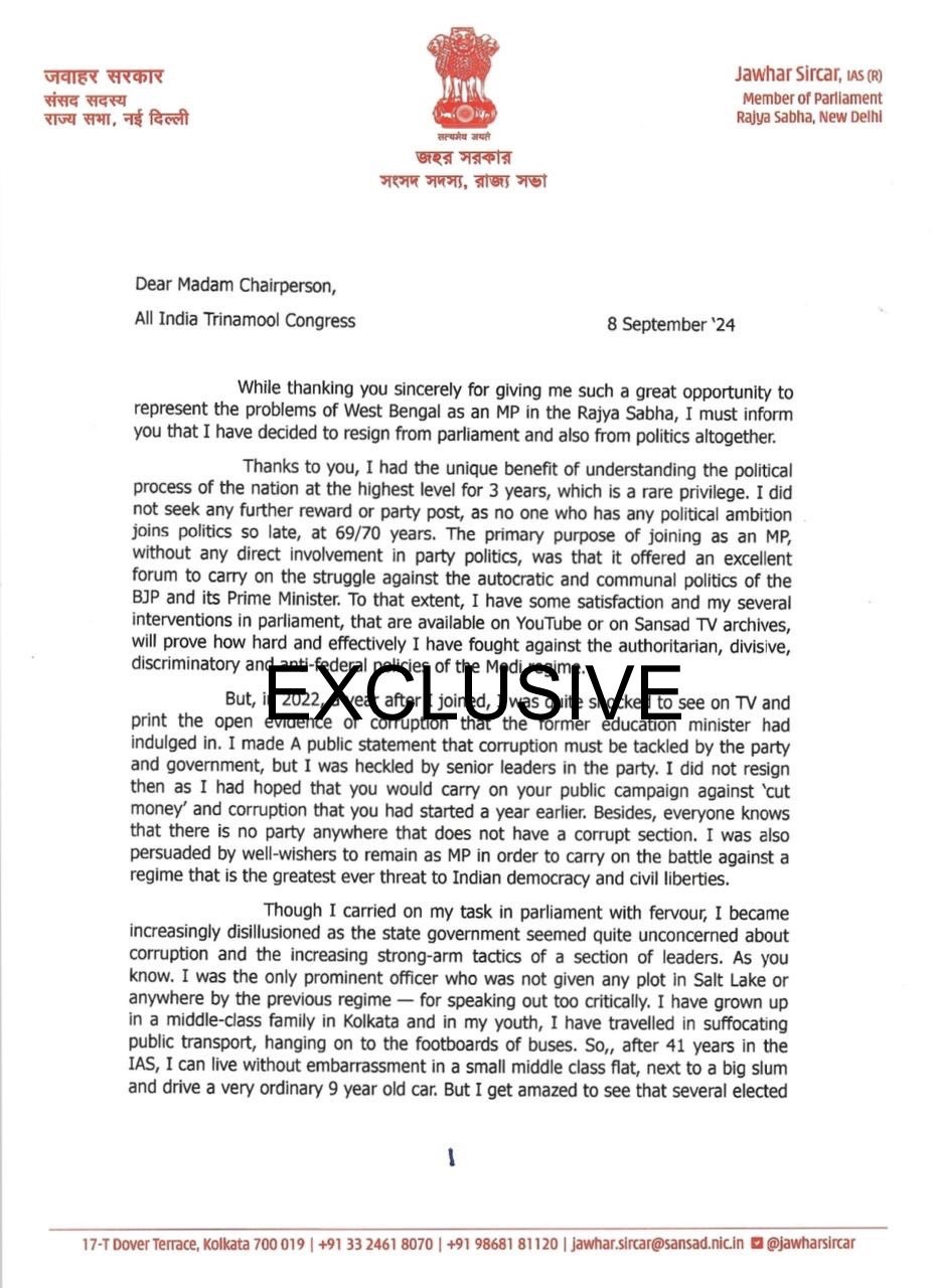 आरजी कर मेडिकल कालेज अस्पताल में प्रशिक्षु महिला डाक्टर के साथ हुई दरिंदगी के विरोध में तृणमूल कांग्रेस के राज्यसभा के सदस्य जवाहर सरकार ने रविवार को इस्तीफा दे दिया है। उन्होंने मुख्यमंत्री व पार्टी सुप्रीमो ममता बनर्जी को पत्र लिखकर कहा कि मैंने अपना पद छोड़ने का फैसला किया है।