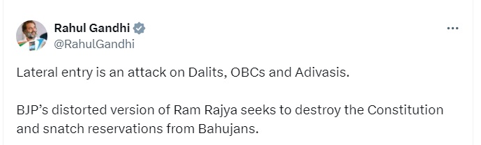 राहुल गांधी ने सोशल मीडिया हैंडल एक्स पर लिखा," लैटरल एंट्री दलितों, ओबीसी और आदिवासियों पर हमला है। भाजपा का रामराज्य का विकृत संस्करण संविधान को नष्ट करने और बहुजनों से आरक्षण छीनने का प्रयास करता है।"