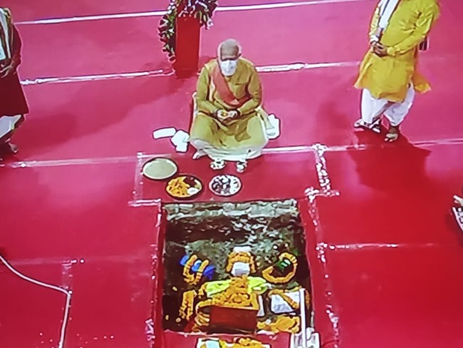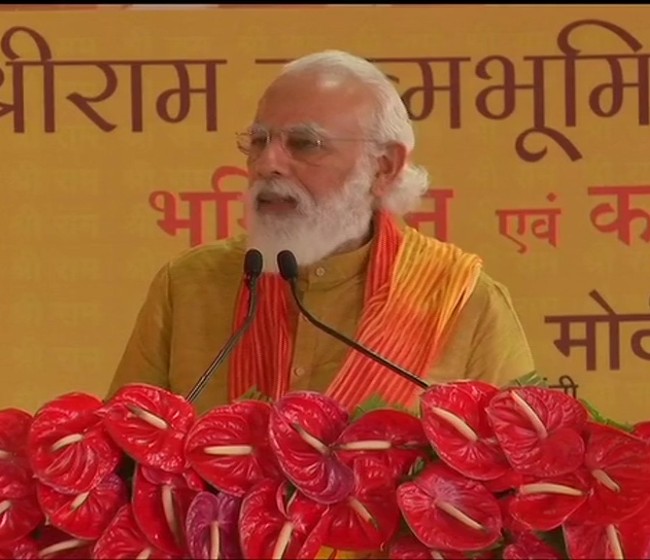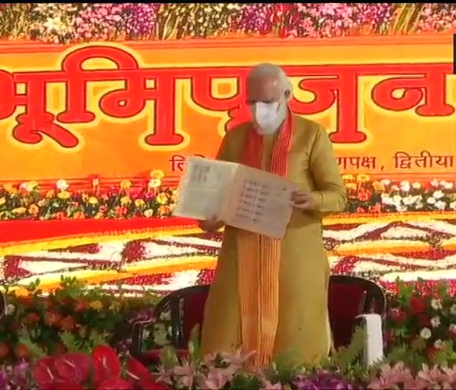 दो गज की दूरी और मास्क पहनने का आह्वान : प्रधानमंत्री नरेंद्र मोदी ने भगवान राम की मर्यादा को मौजूदा परिस्थितियों के सर्वाधिक आवश्यक बताया और मर्यादा के पालन को दो गज की दूरी और मास्क पहनने का आह्वान भी किया। उन्होंने मंदिर को विकास का पर्याय भी बताया। कहा, जहां-जहां भगवान राम के चरण पड़े, वहां-वहां राम सर्किट बनाया जा रहा है। मंदिर बनने यहां का अर्थतंत्र भी बदल जाएगा। पूरी दुनिया से लोग यहां आएंगे। यह मंदिर संस्कृति का आधुनिक प्रतीक बनेगा। प्रधानमंत्री ने कहाकि यह राष्ट्र को जोड़ने का अवसर है। नर को नारायण और वर्तमान को अतीत से व स्वयं को संस्कार जोड़ने का अवसर है। इससे पूर्व उन्होंने हनुमानगढ़ी जाकर बजरंगबली का दर्शन पूजन और मंदिर निर्माण के लिए भूमिपूजन किया। कार्यक्रम के विशिष्ट अतिथि आरएसएस प्रमुख मोहन भागवत, श्रीरामजन्मभूमि तीर्थ क्षेत्र ट्रस्ट के अध्यक्ष महंत नृत्यगोपाल दास, राज्यपाल आनंदीबेन पटेल व मुख्यमंत्री योगी आदित्यनाथ समेत दिग्गज संत व अतिथिगण मौजूद रहे। कार्यक्रम का संचालन ट्रस्ट के महासचिव चंपत राय ने किया।
