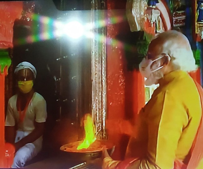 -पारंपरिक हिंदू वेशभूषा धोती-कुर्ता में पीएम मोदी : प्रधानमंत्री नरेंद्र मोदी पारंपरिक हिंदू वेशभूषा धोती-कुर्ता में हैं। हिंदू धर्म में पूजा के समय धोती-कुर्ता का विशेष महत्व है। श्रीराम मंदिर भूमि पूजन कार्यक्रम के लिए पीएम मोदी ने इसे विशेष रूप से धारण किया है।