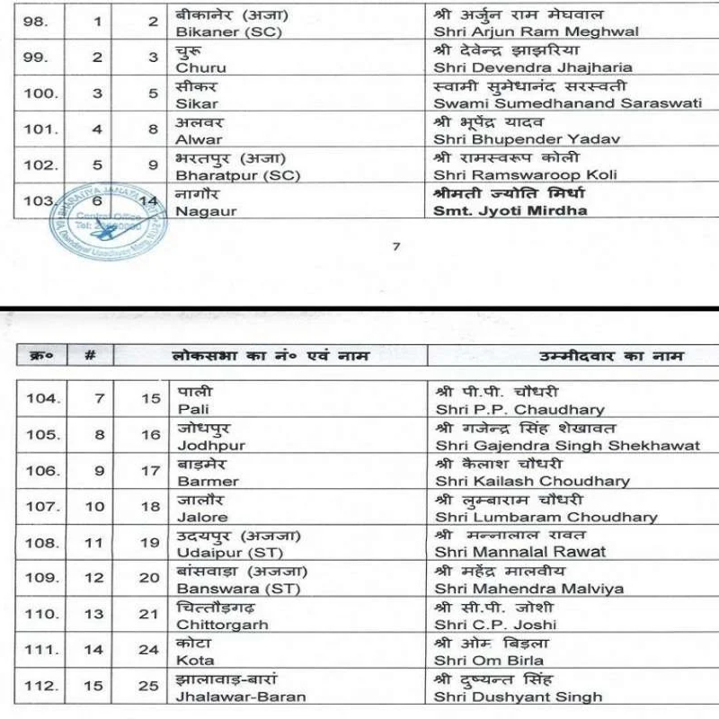 राजस्थान के उम्मीदवारों के नाम (Lok Sabha Elections 2024 Rajasthan BJP First List)