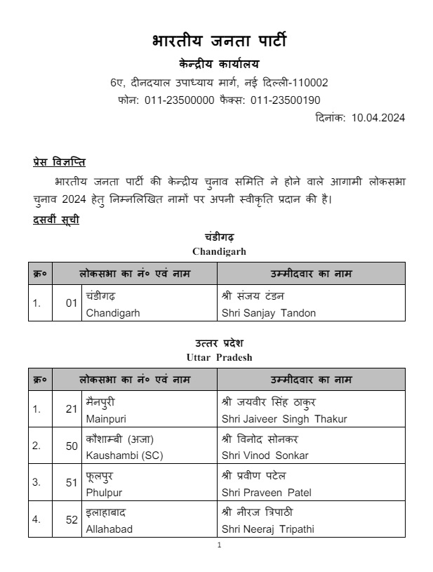 डिजिटल डेस्क, नई दिल्ली। बीजेपी ने लोकसभा चुनाव के लिए अपने उम्मीदवारों की 10वीं सूची जारी कर दी है। इस लिस्ट में 9 उम्मीदवारों को टिकट देने की घोषणा की गई है। इस लिस्ट में पार्टी ने यूपी, बंगाल और चंडीगढ़ लोकसभी सीटों से प्रत्याशियों की घोषणा की है।