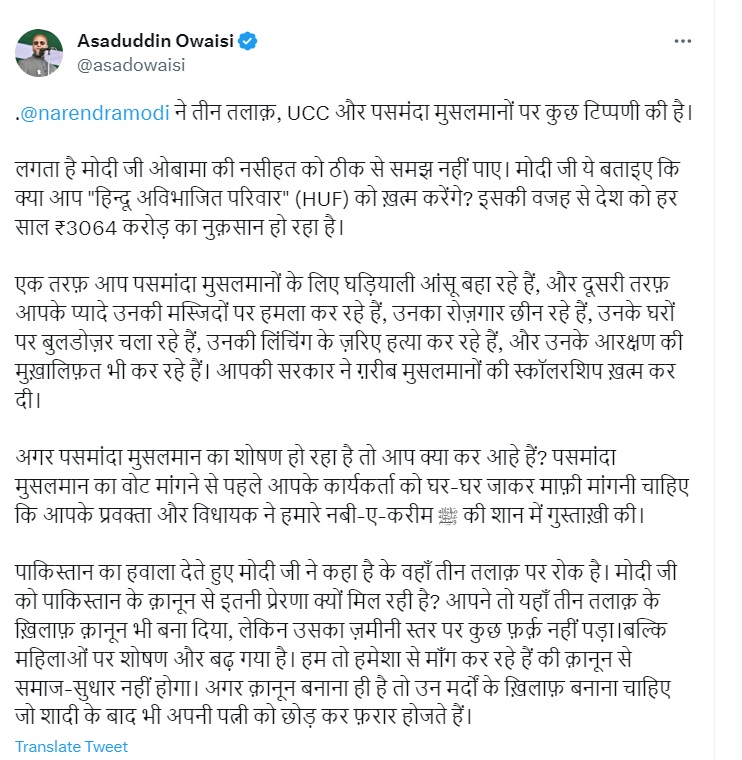 इस पोस्ट पर उन्होंने मोदी सरकार पर जमकर हमला बोला है। अवौसी ने लिखा,"पीएम नरेंद्र मोदी ने तीन तलाक़, UCC और पसमंदा मुसलमानों पर कुछ टिप्पणी की है। लगता है मोदी जी ओबामा की नसीहत को ठीक से समझ नहीं पाए। मोदी जी ये बताइए कि क्या आप "हिन्दू अविभाजित परिवार" (HUF) को ख़त्म करेंगे? इसकी वजह से देश को हर साल ₹3064 करोड़ का नुकसान हो रहा है।