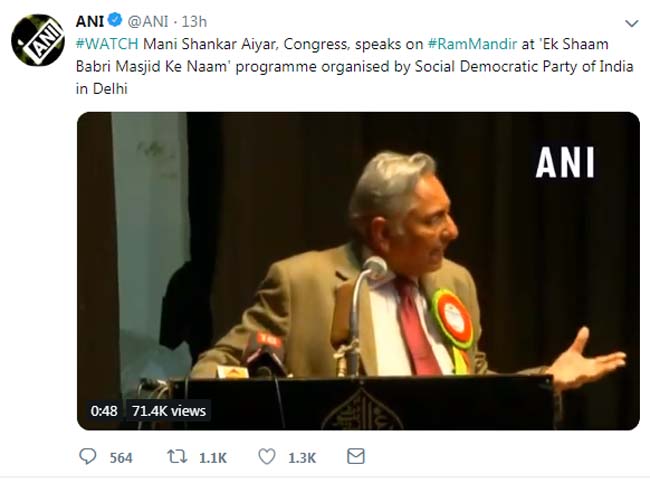 अय्यर ने बाबरी मस्जिद गिराए जाने को लेकर कांग्रेस को भी कठघरे में खड़ा किया और कहा कि उस वक्त केंद्र में कांग्रेस की सरकार थी। अगर पार्टी चाहती तो 6 दिसंबर 1992 को बाबरी मस्जिद ना गिरती। अय्यर ने महात्मा गांधी की शहादत और बाबरी मस्जिद के गिरने को एक जैसा बताते हुए कहा कि क्या मुसलमान इस देश में सुरक्षित रह सकते है? दिल्ली के गालिब इंस्टीट्यूट में आयोजित इस कार्यक्रम में पूर्व केंद्रीय मंत्री शरद यादव भी मौजूद रहे।
