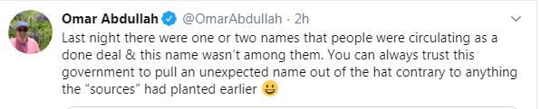 मनोज सिन्हा के उपराज्यपाल पद पर नियुक्ति के बाद जम्मू कश्मीर के पूर्व सीएम उमर अब्दुल्ला ने ट्वीट कर कहा- कल रात एक या दो नाम थे, जिनके नाम सामने आए थे और इनका नाम उनके बीच नहीं था। आप इस सरकार पर हमेशा भरोसा कर सकते हैं कि ये स्रोतों से पहले लगाए गए किसी भी कयास के विपरीत अप्रत्याशित नाम सामने आता है।
