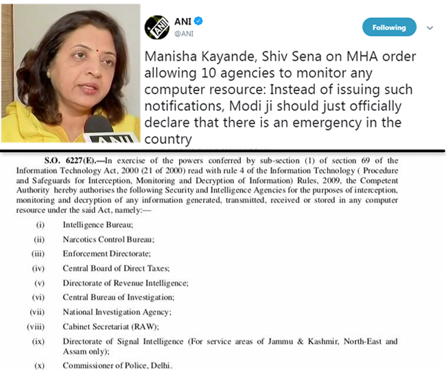 नई दिल्ली, जेएनएन। केंद्र सरकारी की ओर से जारी नए निगरानी नियमों पर विवाद थमता नजर नहीं आ रहा है। विपक्षी दलों के बाद अब भाजपा के सहयोगी दल भी इस फैसले पर उंगली उठाने लगे हैं। महाराष्ट्र सरकार में भागीदार और केंद्र में एनडीए के घटक दल शिवसेना ने इस सर्कुलर पर आपत्ति जताई और कहा कि सरकार को सीधे तौर पर आपातकाल घोषित कर देना चाहिए।