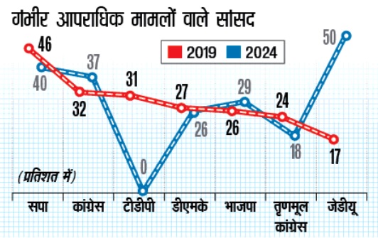 जहां 2009 में लोकसभा में 30 फीसद दागी सांसद थे, वहीं 2014 में 34, 2019 में 43 और 2024 में यह बढ़कर 46 फीसद जा पहुंची है।