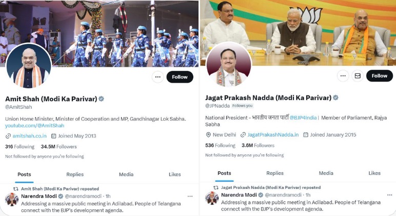 पीएम मोदी के इस बयान के बाद भाजपा नेताओं ने सोशल मीडिया हैंडल एक्स पर अपना बायो चेंज करते हुए 'मोदी का परिवार' लिख दिया है। अमित शाह, पीयूष गोयल, नितिन गडकरी समेत कई भाजपा नेताओं X पर अपना बायो बदल लिया है।