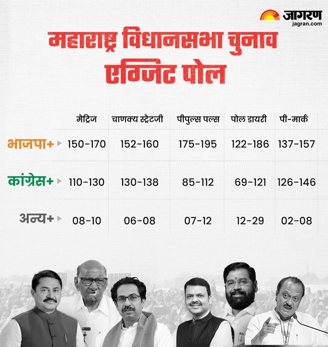 पीपल्स पल्स ने महायुति को 175-195 तो एमवीए को 85-112 सीटों का अनुमान जताया है। मैट्रिज ने महायुति को 150-170 तो एमवीए को 110-130 और पीमार्क ने राजग को 137-157 व एमवीए को 126-146 सीटों का अनुमान जताया है।