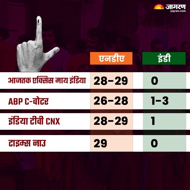 एबीपी सी वोटर के मुताबिक, एनडीए को 26 से 28 सीटें मिल सकती हैं। आई.एन.डी.आई. गठबंधन को 1 से लेकर 3 सीटें मिलते दिख रही है। वहीं, सीट शेयर की बात करें तो एनडीए को 53.5 फीसदी वोट मिल रहे हैं। वहीं. आई.एन.डी.आई. गठबंधन को 37.6 फीसद वोट मिलने जा रही है।