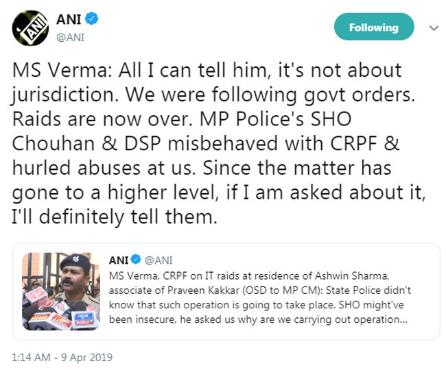 मामले में सीआरपीएफ अधिकारी एमएस वर्मा ने मंगलवार को मीडिया से बातचीत में बताया कि राज्य पुलिस को इस कार्रवाई की पहले से कोई सूचना नहीं थी। शायद इसलिए एसएचओ (थानाध्यक्ष) खुद को असुरक्षित महसूस कर रहे हैं। उन्होंने हमसे पूछा कि हम उनके क्षेत्र में बिना उनकी अनुमति के कैसे कोई कार्रवाई कर सकते हैं। एमएस वर्मान के अनुसार उस वक्त वह राज्य को केवल इतना बता सकते थे कि ये मामला अधिकार क्षेत्र (Jurisdiction) का नहीं है। हम केवल सरकार के आदेशों का पालन कर रहे हैं। इस पर मध्य प्रदेश पुलिस के एसएचओ और डीएसपी ने सीआरपीएफ जवानों से बदतमीजी और गाली-गलौच की। मामले में उच्चाधिकारियों से शिकायत कर दी गई है। अगर जांच के दौरान मुझसे पूछा जाता है तो मैं पक्का पुलिस की करतूत उजागर करूंगा। एमएस वर्मा ने बताया कि छापेमारी फिलहाल पूरी हो चुकी है। सीआरपीएफ अधिकारी एमएस वर्मा, मंगलवार को मुख्यमंत्री के ओएसडी प्रवीण कक्कड़ के करीबी अश्विन शर्मा के यहां आयकर की छापेमारी के दौरान मौजूद थे।
