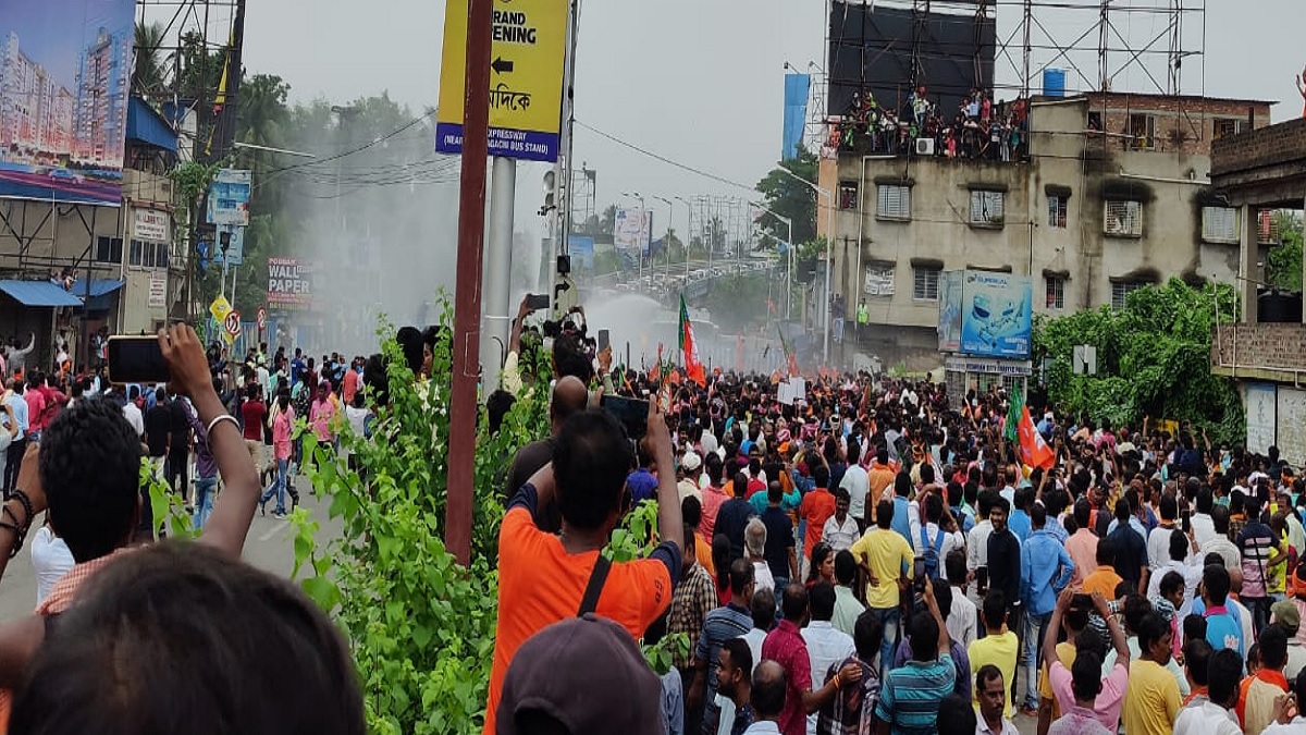 #WATCH | West Bengal: Police use water cannons and tear gas shells to stop and disperse BJP workers in Santragachhi area of Howrah, amid their call for Nabanna Chalo march.