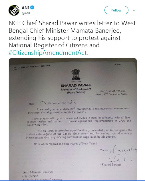 NRC और CAA के विरोध प्रदर्शन को लेकर शरद पवार का समर्थन, ममता बनर्जी को लिखा पत्र