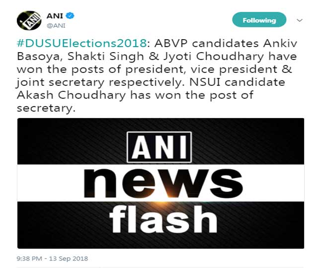 DUSU result 2018: ABVP ने अध्यक्ष समेत 3 पदों पर लहराया परचम, NSUI को सिर्फ 1 पद